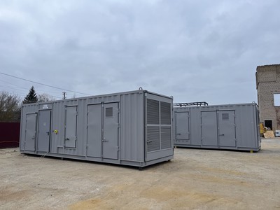 Установки размещены в девятиметровых универсальных блок-контейнерах производства ЭнергоПроф. Конструкция имеет цельносварной, антивандальный, металлический корпус из профильного металла. Стены и крыша выполнены из профилированных листов толщиной 1,5 мм с антикоррозионной обработкой. Утепление минеральной ватой позволяет эксплуатировать станции при температурах окружающей среды от -40 до +45 градусов. Данный тип контейнера предназначен для размещения установок большой мощности, что было необходимо проекту.